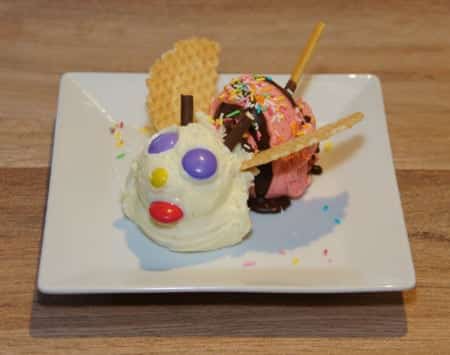 Mikado-Schokogebäckstäbchen, Smarties, Waffeln, Stracciatellasauce, 2 Kugeln Eis (Erdbeer und Vanille – zus. Kiddybox-Kindergeschenkset optional) NCUFKE