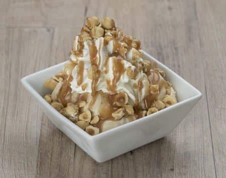 Ganze und gehackte Haselnüsse, Haselnusssauce, 3 Kugeln Haselnusseis, Schlagsahne NG