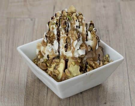 Gemischte Nüsse im Ganzen und gehackt, Haselnuss- und Schokoladensauce, 3 Kugeln Eis (Vanille, Schokolade, Stracciatella), Schlagsahne NUCO