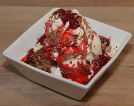 Joghurt, Himbeeren, Himbeersauce, Schokoladenraspel, 3 Kugeln Joghurteis, Schlagsahne NUVH