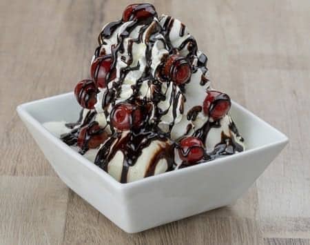 Sauerkirschen, Schokoladensauce und Schokoladenraspel, Joghurt, 3 Kugeln Joghurteis, Schlagsahne NUV