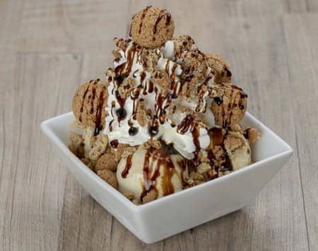Karamellsauce,Keksbrösel, Amaretti-Plätzchen, 3 Kugeln Karamelleis, Schlagsahne N
