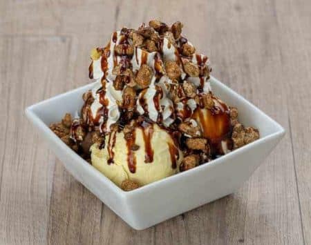 Karamell, karamellisierte Mandeln, Karamellsauce, Mandelkrokant, 3 Kugeln Eis (Vanille, Schokolade, Stracciatella), Schlagsahne NQUCVE