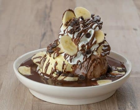 Banane, Schokoladensauce, warme Zartbitterschokolade, Schokoladenraspel, 3 Kugeln Eis (Vanille, Schokolade), Schlagsahne NUC