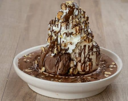 Ganze und gehackte Haselnüsse, Nutella, warme Zartbitterschokolade, 3 Kugeln Eis (Haselnuss, Schokolade), Schlagsahne NUG